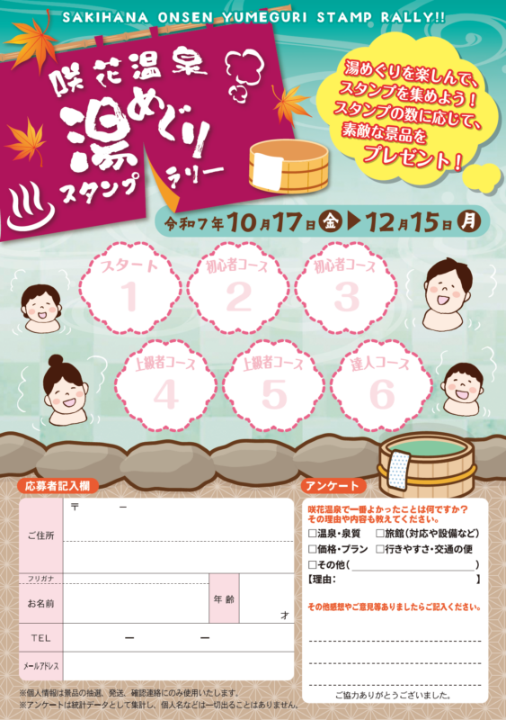 ・初心者コース:スタンプ2~3個で「お好きな旅館の日帰り入浴」(先着順)